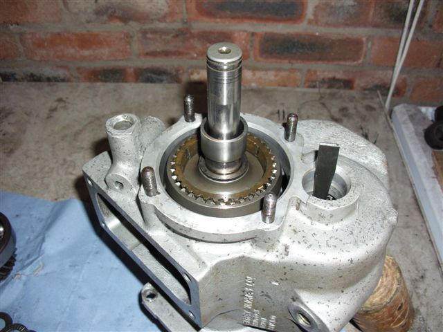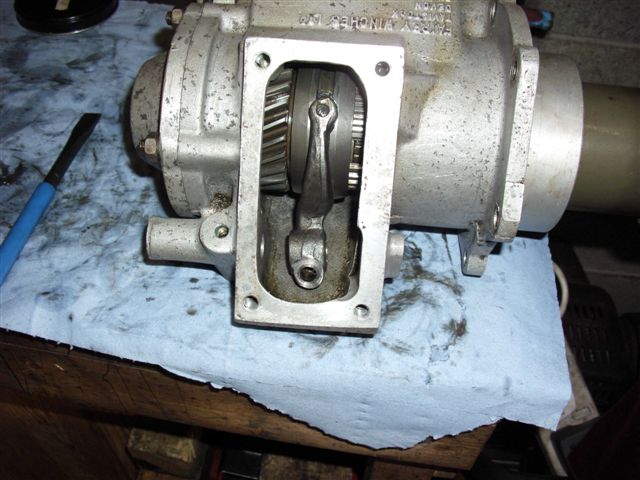 A view of the casing showing a rod in place of the lashaft bearing pin.