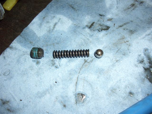 Ball, spring, and packing piece. The packing piece has a curve on one face - this should follow the curve of the drive gear.