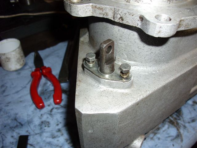 Selector arm in place. the bolt goes through from the top - the threaded part therefore is below.